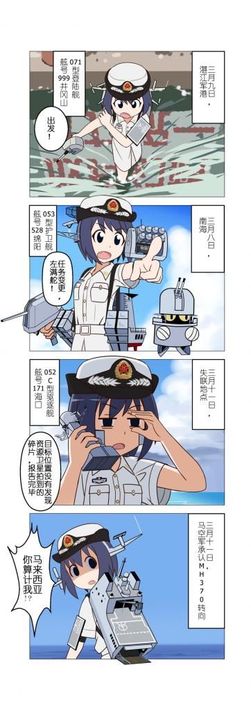 | 马年的中国诸多不顺,昆明、各种岛礁、港独、服贸、MH370,可以感觉到一种郁闷的氛围笼罩。 在25日的地铁里看到马来西亚草率地宣布航班坠毁后,我也产生不满了。 不是事实或可能性的问题,而是措辞和措施的问题。 也是个机会兑现画舰娘,结果太过投入了不知不觉用掉了两个星期的业余时间(一直以为只过去一个星期),第一次画这么豪华的四格。 本来还有很多元素要画的(阿猫小鸟的登陆舰直升机之类)。 |